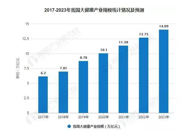 据《中国大健康产业战略规划和企业战略咨询报告》统计数据显示,2019年我国大健康产业规模达到8.78万亿元,预计2020年,我国大健康产业规模突破10万亿元。2019-2023年均复合增长率约为12.55%,并预测在2023年我国大健康产业规模将突破14万亿元。