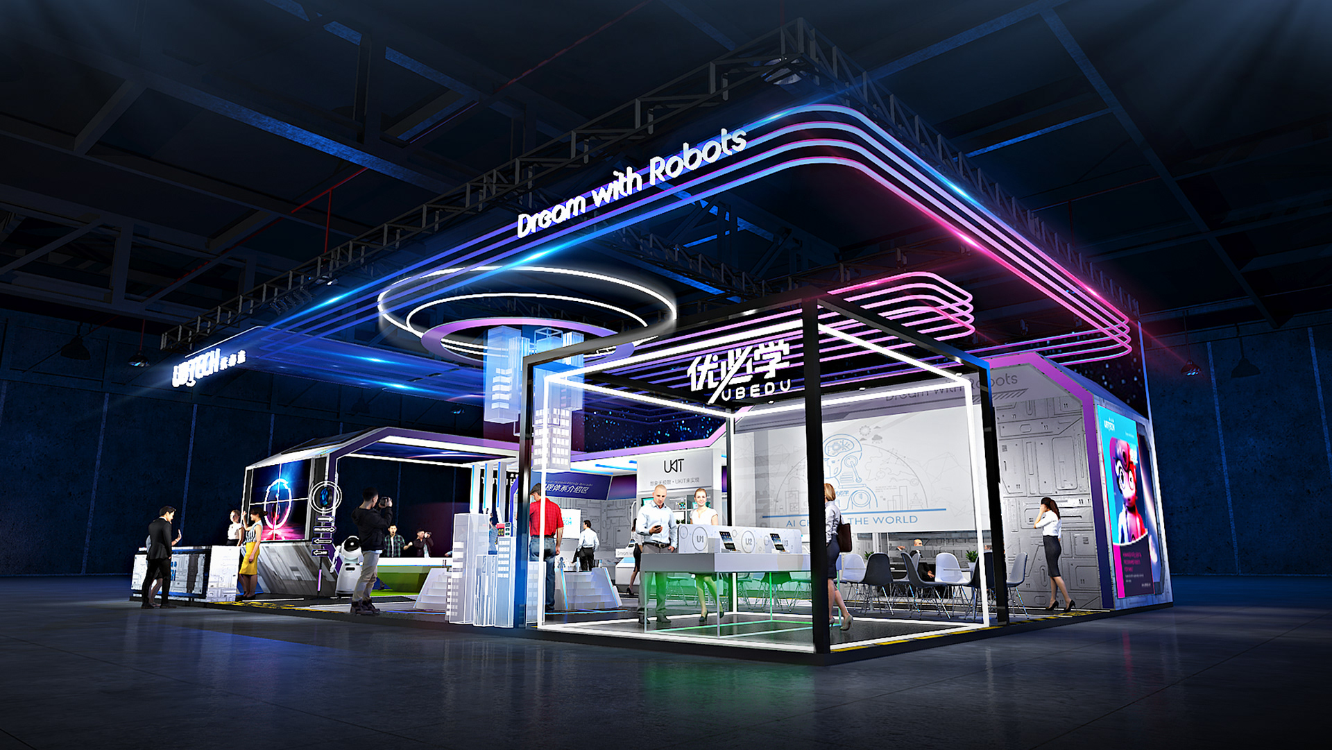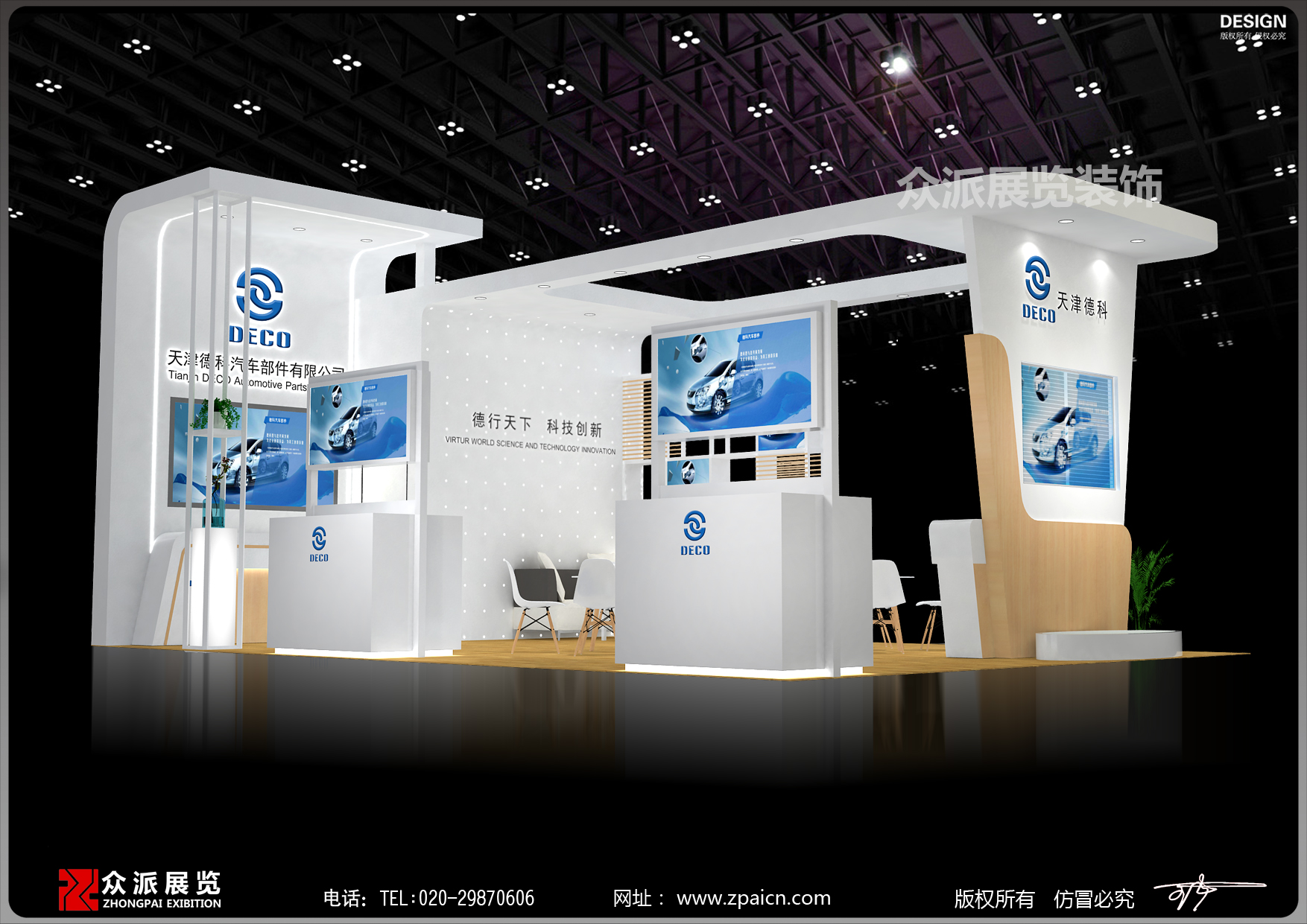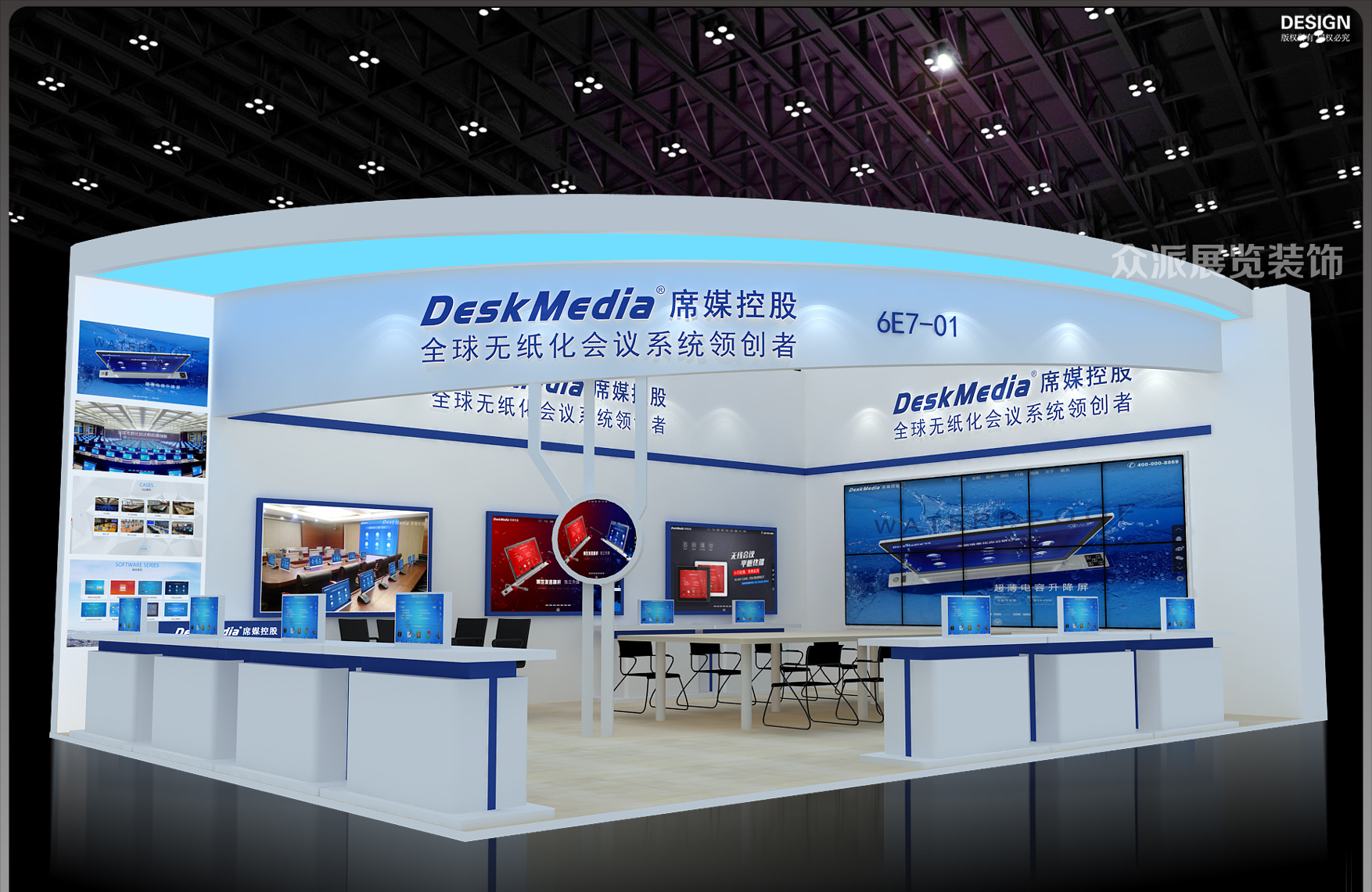 第二点在展台的布局时,显示通道和空间界面的颜色相对较淡的明亮的颜色。使用这样的颜色在显示通道或隔断、展柜设计等部分的外观,可以增加空间感,反之亦然,用深颜色会使空间缩小,让人产生压迫感。